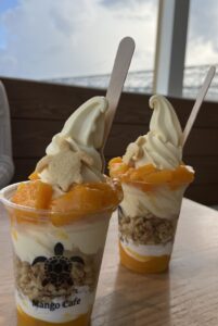 ドライブ後の休憩はBlue Turtle Farm Mango Cafe(マンゴーカフェ)へ🥭。自社農園産の完熟マンゴーを使ったスイーツが揃い、畑の中に立つロケーションがまたいい雰囲気。「そのまんまマンゴー削り」など個性的なメニューを海の景色とともにゆっくり楽しめます。