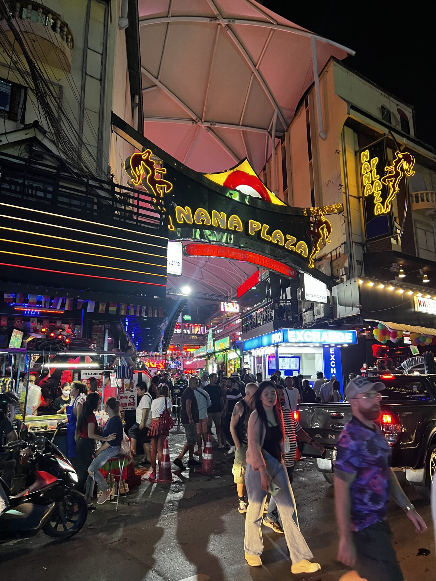 ナナプラザ(Nana Entertainment Plaza)は、バンコク・スクンビット通りのソイ4(ナナ通り)にある3階建て・コの字型のゴーゴーバー複合施設です。「世界最大の大人の遊び場」と呼ばれることもあり、25〜30店舗以上のバーが軒を連ねています。